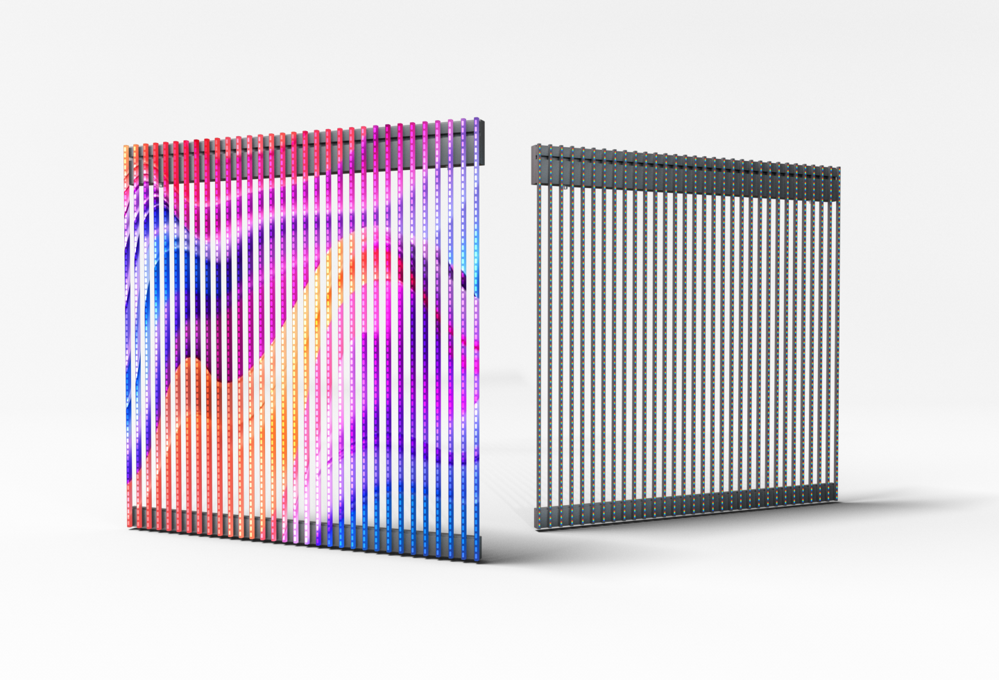 Изображение на медиафасаде формируется светодиодами с определенным шагом пикселя Р15-31 мм. Особенность конструкции на основе горизонтальных направляющих (ламелей) объясняет двойное обозначение шага (вертикаль/горизонталь) и позволяет медиафасаду повторять изгибы здания.
