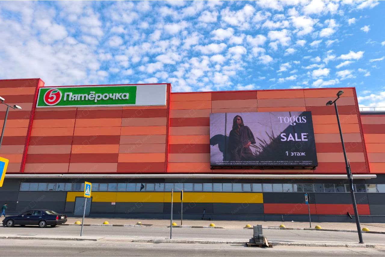 Уличный экран, установленный на фасаде здания, транслирует рекламные ролики, тем самым привлекая максимальное внимание пешеходов и водителей вблизи торгового центра. Современный LED экран с шагом Р8 адаптирован к любым погодным условиям, и благодаря повышенной яркости публикуемый контент видно в ясную погоду, в туман, а также с дальнего расстояния.