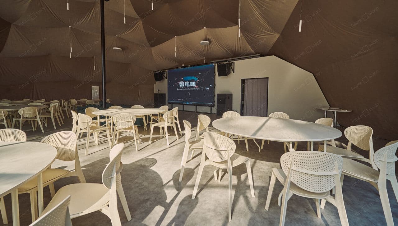 Светодиодный экран размером 4480 х 2560 мм обладает повышенной чёткостью изображения, а также обеспечивает отличную видимость с любого места в шатре.